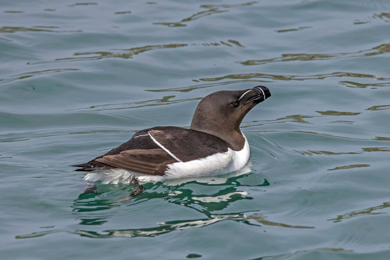 As you round the cliffs at the south end of Eday, keep a lookout for members of the Auk family such as Razorbills, which are the closest living relative of the extinct Great Auk. They are black on top and white below and have a large blunt beak with white striped markings. The beak will help you to tell the Razorbill apart from the similar-looking Common Guillemot, as Guillemots have a much narrower pointed beak and they are a dark shade of brown, not black. Black guillemots are smaller and have very distinctive red legs and feet, as well as a white patch on the wing.